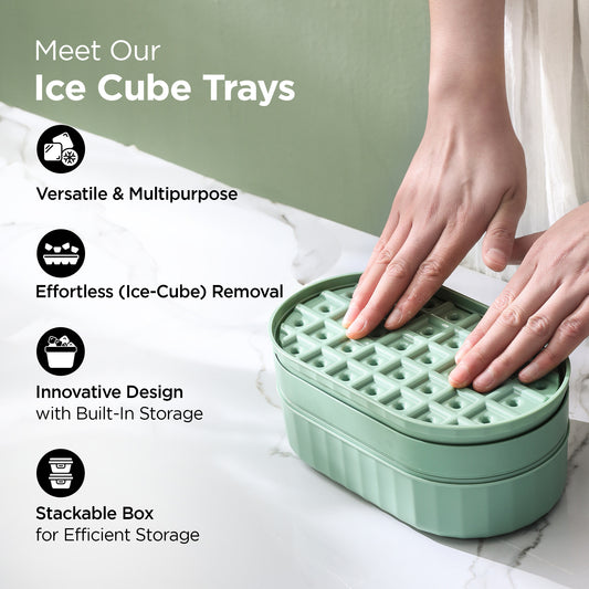 2 Layer Ice Cube Tray: BPA Free Green Moulds with Storage Box | 72 Compartments | Easy Demolding