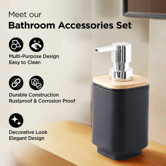 3pcs ABS Bathroom Accessories Set | Soap Dispenser (340ML), Toothbrush Holder & Organizer | Liquid Soap Dispenser for Bathroom | Bathroom Organiser | Handwash Dispenser | Black