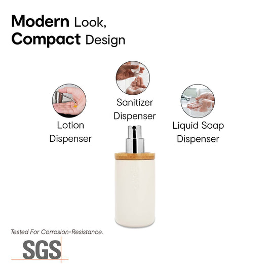 Liquid Soap Dispenser - Bamboo & White Ceramic | For Bathroom & Kitchen | 320ml | Stylish Organizer