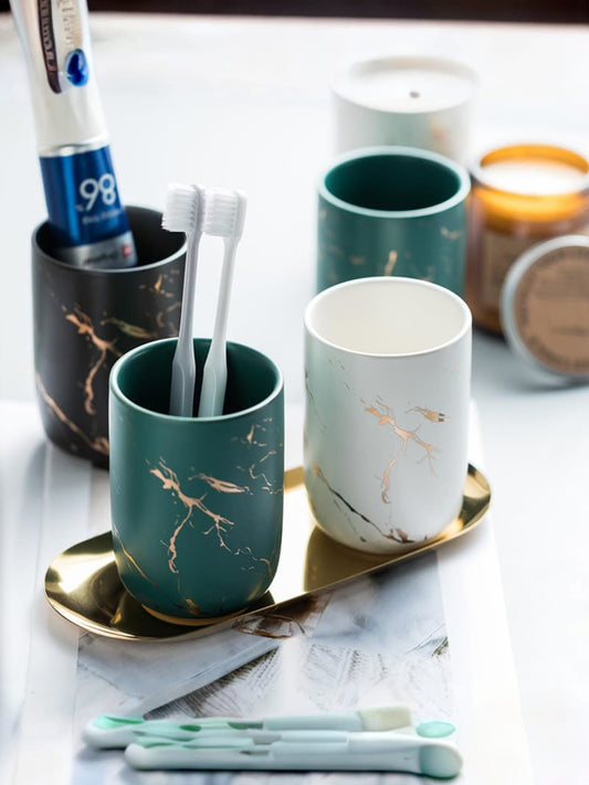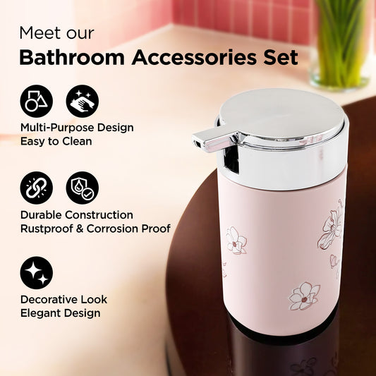 Bathroom Accessories Set of 4 Pcs | Soap Dispenser for Bathroom (7*7*13cm) | Toothbrush Holder (7*7*11cm) | Soap Case for Bathroom (13*9*2cm) | Mouth wash cup | Printed Bathroom Accessories Items
