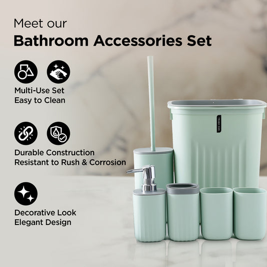 6 Piece Bathroom Accessories Set with Round Cover | Soap Dispenser(650ml), Toothbrush Holder, Mouth Wash Cup, Toilet Brush Holder & Dustbin(7L) | Soap Dispenser for Bathroom | Green