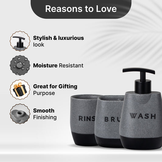 3 Pcs Polyresin Bathroom Accessories Set | Liquid Soap Dispenser For Bathroom | Toothbrush Holder | Tumbler | Handwash Dispenser | Bathroom Accessories | Soap Dispenser For Kitchen | Black - Grey