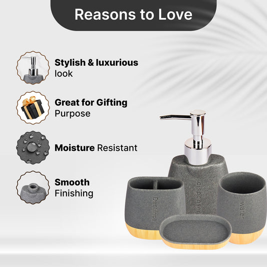 Polyresin 4-Piece Bathroom Accessories Set | Soap Holder, Liquid Soap Dispenser for Bathroom (250ml), Tumbler & Toothbrush Holder | Moisture Resistant | Scratch Proof | Grey