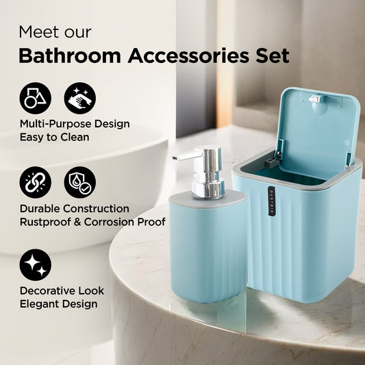 Bathroom Accessories Set of 4 Pcs | Soap Dispenser for Bathroom(7 * 7 * 15cm) | Dustbin for Bathroom | Soap Case for Bathroom | Mouth Wash Cup Bathroom Accessories Items-Blue
