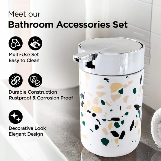Bathroom Accessories Set | 4 Piece | Soap Dispenser for Bathroom |Tooth Brush Holder| Mouth Wash Cup | Soap Dish | for Bathroom | Attractive and Stylish Terrazzo Design | White Concrete Mix Look
