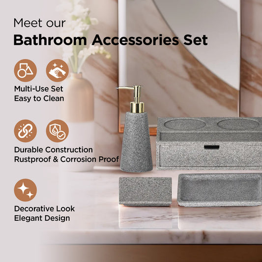 5Pcs Bathroom Accessory Set - Premium Polyresin | Soap Dispenser, Soap Dish, Towel Tray, Storage Box | Grey