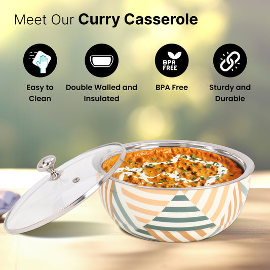 UMAI Double Walled Insulated Serving Curry Casserole (1.5L) | Stainless Steel Hotpot with Transparent Glass Lid & Coaster | Hot Pot for Roti Box | Curry Bowls for Serving