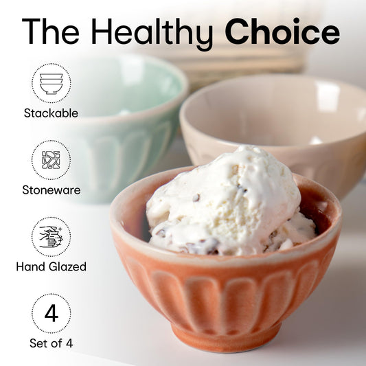 Hand Glazed Icecream Bowls - Set of 4 | Stoneware Embossed Oven Safe Dessert Cup for Serving Sundaes, Sweets, Snacks, Fruits, Pudding, Nuts or Dip| 7.5 (H) x 13cm (Dia) | Pink, Brown, Green, Red