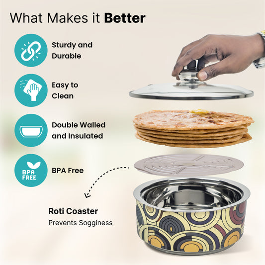 304 Stainless Steel Insulated Casserole (1.5L) | Double Wall Insulation, Heat Retaining Body & Easy Lock Lid Mechanism |Hot Roti Box | Hot Case | Wobble Free Base, Glossy Durable