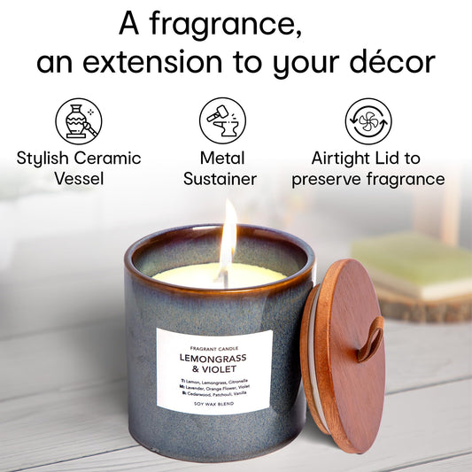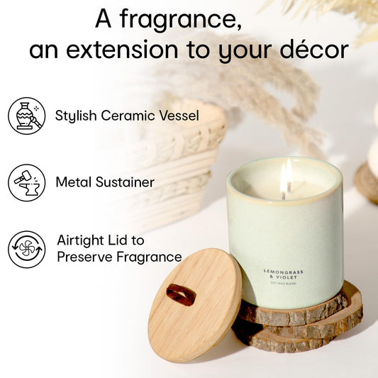 Scented Candle with Wooden lid | Soy Wax Blend Double-Wick Fragrant jar Candle | Aesthetic votives for Home, décor, Gifting | Lemongrass & Violet Aroma Pillar Candle | 1300gm, 250 hrs Burn time