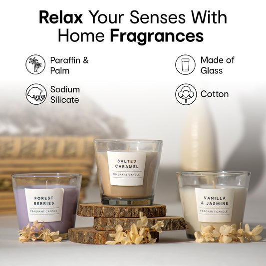Scented Candles for Home | Forest Berry, Salted Caramel, and Vanilla Jasmine Scent |Aromatherapy Soy Wax Candles for Home Decor |Perfume Candles for Home | Reusable Glass Jars | Gift Set of 3