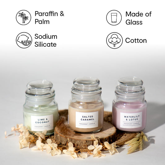 Scented Candles for Home | Lime & Coconut, Salted Caramel, and Waterlily & Lotus Scent | Aroma Romantic Scented Candles for Bedroom | Aromatherapy Soy Wax Candles for Home Decor | Gift Set of 3