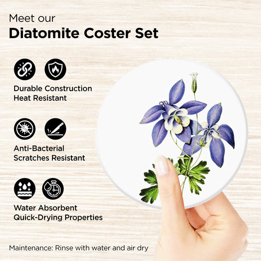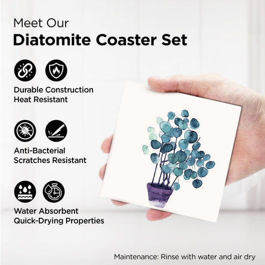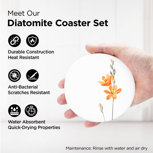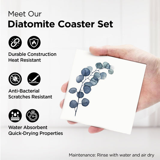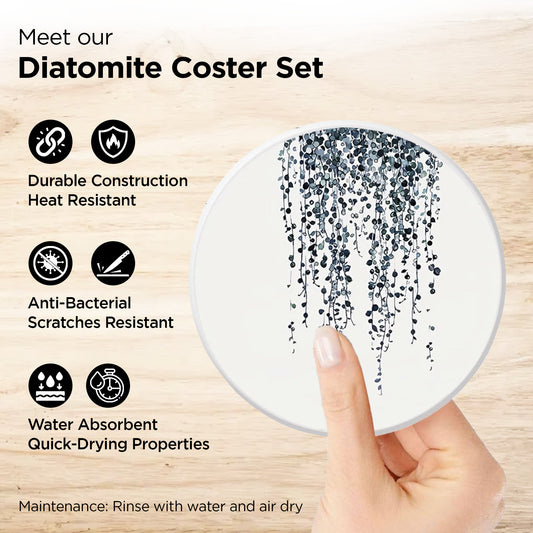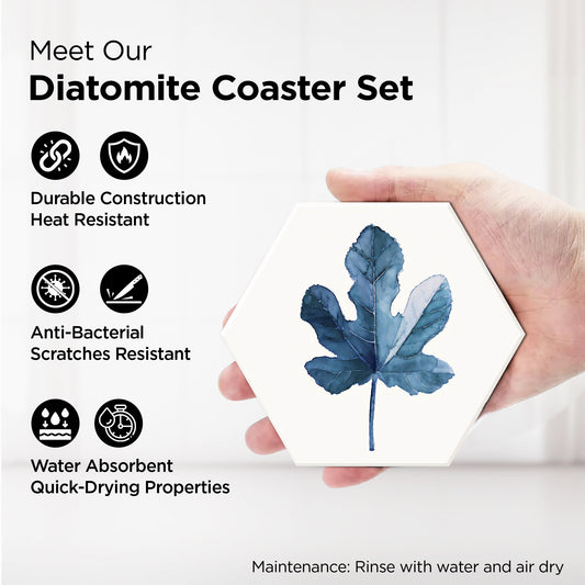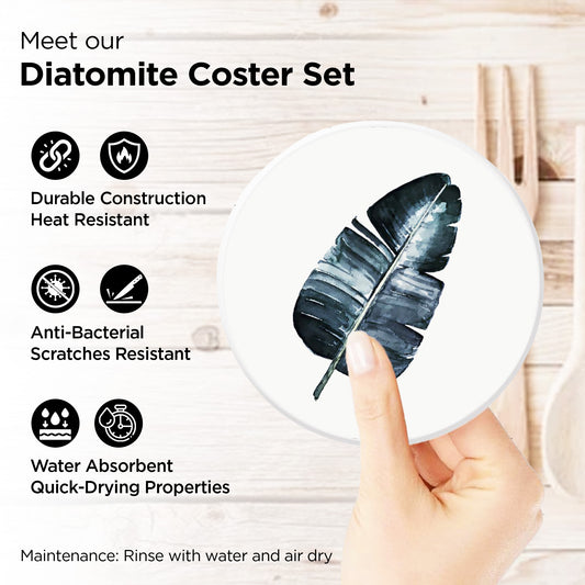 Diatomite Coaster Set of 6 with Cork Steel Holder (Dia - 10cm, Thick - 8mm) | Absorbent Coasters for Drinks Coffee Glasses | Dining Table Decor Accessories (Leaf Print)