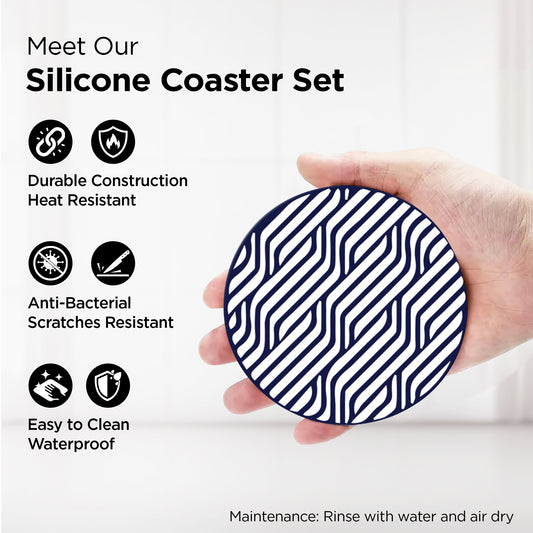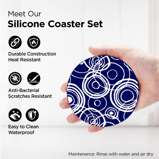 Silicone Coaster Set of 6 (Dia- 10cm) with Plastic Holder Dining Table Decor Accessories | Glasses Coffee Mugs Tea Coaster | Unique Design | Office Home Table Top Coasters (Navy White)