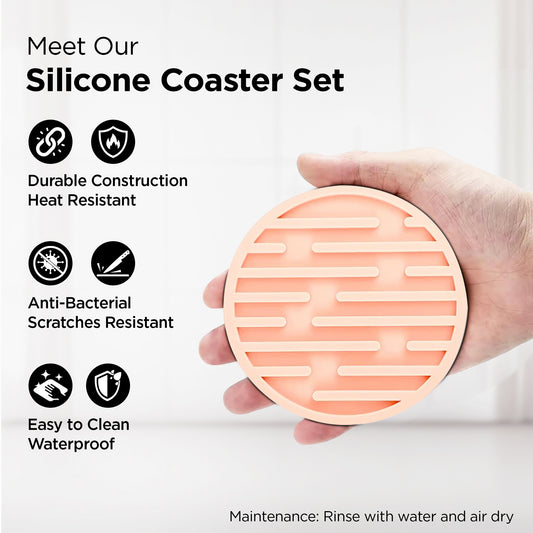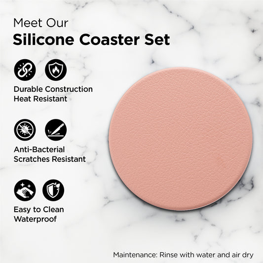 Silicone Coasters Set of 6 (Dia - 10cm) | Dining Table Decor Accessories | Cups/Coffee Mugs/Glasses Coaster with Holder | Glass Cover Lid |Kitty Party Return Gifts for Women (Pink)
