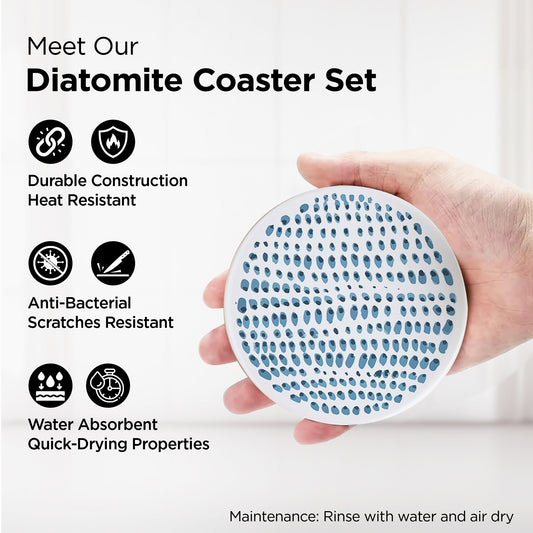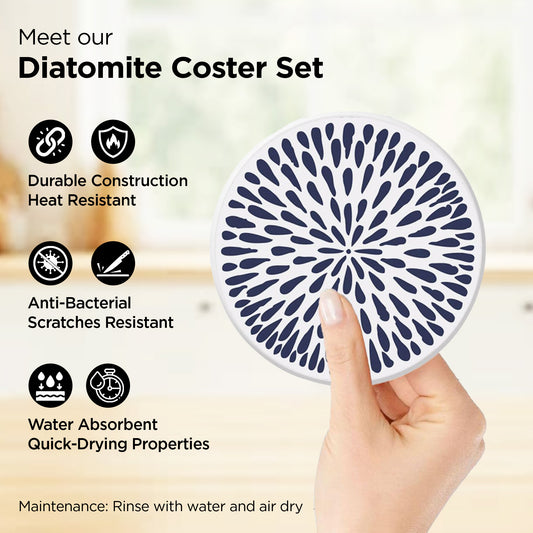 Set of 6: Diatomite Coasters with Cork Steel Holder | Absorbent for Cups & Glasses | Navy and White | Round