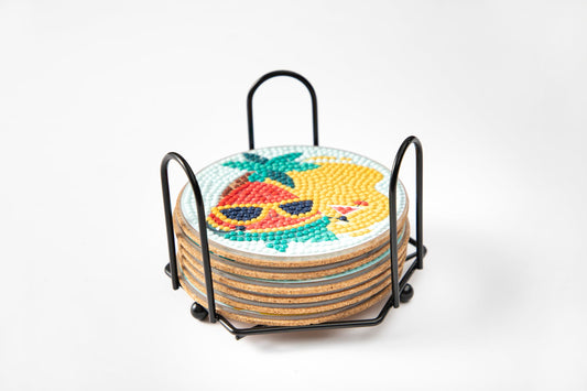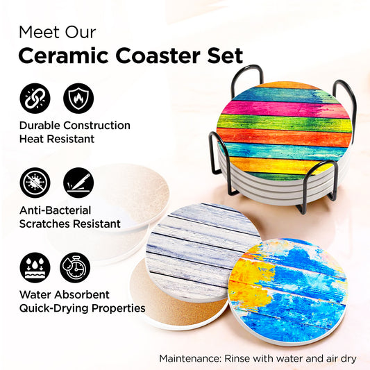 UMAI Coaster Set of 6 | Ceramic Drink Coasters with Cork Steel Holder | Dining Table Decor Accessories for Cups, Coffee Mugs, and Glasses | Attractive Multicolor Design | Home/Office Table Top Decor.
