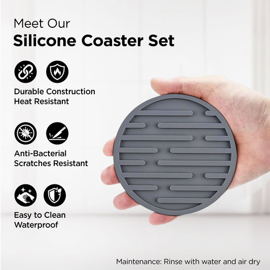 Set of 6: Silicone Coasters with Holder | Dining Table Decor for Cups, Mugs & Glasses | Grey | Round
