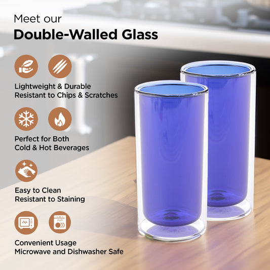 Double Walled Glass Coffee Mug Set of 2-400ml | Borosilicate Glass Teacups | High Thermal Resistance | Microwave & Dishwasher Safe | Gifting Pack for Friends & Family | Blue