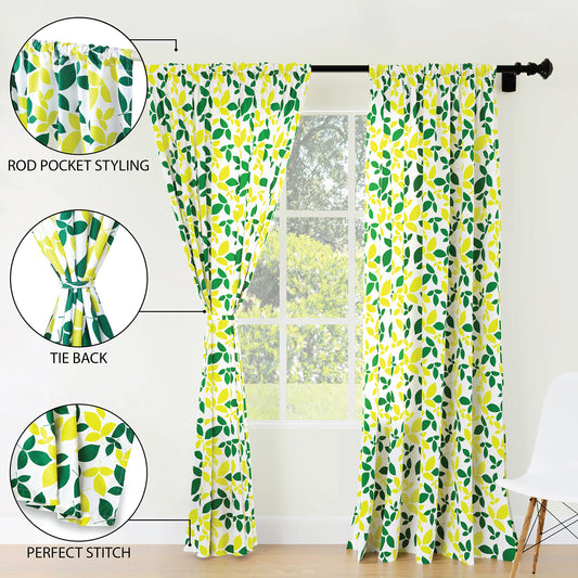 XO Window Curtain 7 ft Set of 2, Polyester Printed with Rod Pocket, Tie Back, Light-Filtering, Semi Sheer/Transparent Curtains- Kitchen, Bedroom, Living Room (140x213 cm), Reverse Leaf Yellow