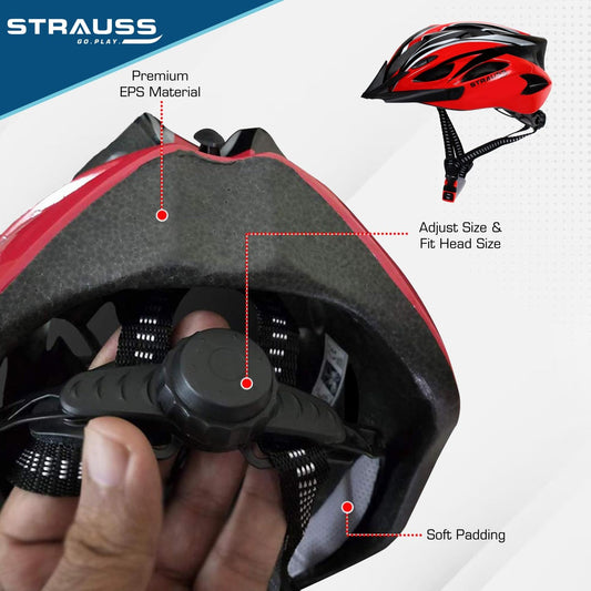Strauss Cycling Helmet , ELITE | Light Weight with Superior Ventilation | Mountain, Road Bike & Skating Helmet With Premium White EPS Foam Lining| Ideal for Adults and Kids| Size: Junior, (Black and Red)