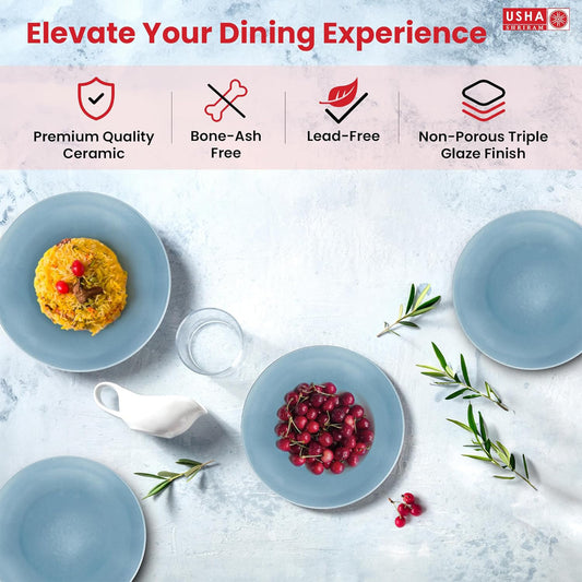 USHA SHRIRAM Ceramic Dinner Set (14 Pcs) | Microwave Safe Dinner Plates and Bowls Sets Cookware | Chip Resistant Dinnerware Sets | House Warming Gifts New Home for Couple Men Women (Blue)