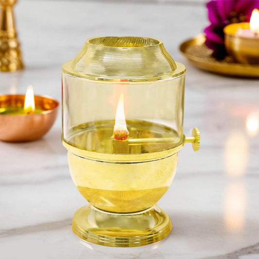 100% Pure Brass Akhand Jyot Diya with Adjustable Bati Knob, Wick Lifting Screw Lever & Glass Cover (Big Size, 150 ml Oil Capacity, Stay Lit for 24 Hours, Wick Included, Authentic Borosilicate)