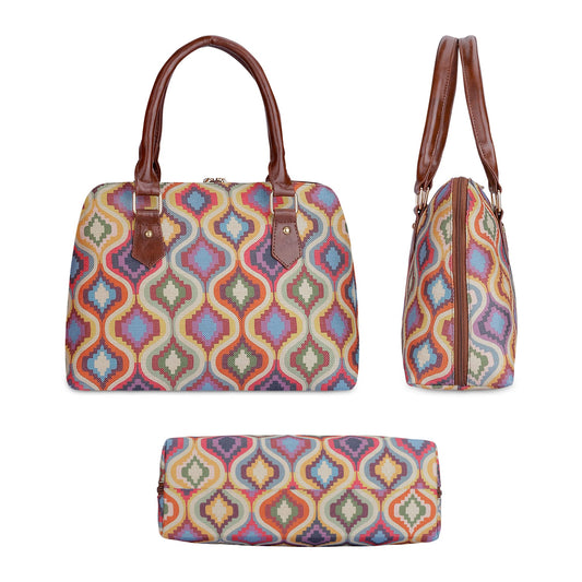 THE CLOWNFISH Valentine Printed Handicraft Fabric & Faux Leather Handbag for Women Office Bag Ladies Shoulder Bag Tote for Women College Girls (Multicolour-Circles)