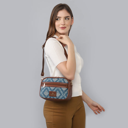 THE CLOWNFISH Lorna Printed Handicraft Fabric & Faux Leather Handbag Sling Bag for Women Office Bag Ladies Shoulder Bag Tote For Women College Girls (Sky Blue-Diamond)