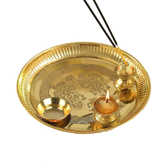Homestic Laxmi Ganesha Pooja Thali | Brass Thali for Diwali Poojan | Thali for Office Temple Poojan | Thali Set for Home with Incense Stick-Diya-Sindoor Holder | 12 Inch | Golden
