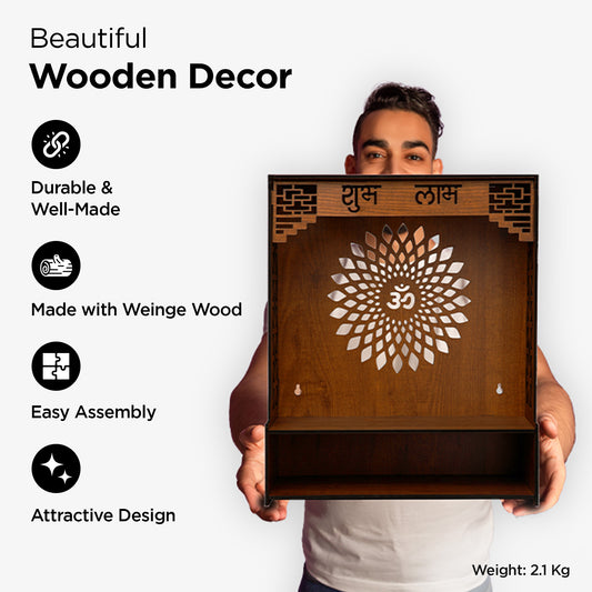 Medium Wooden Pooja Mandir for Home - Wall Mounted with LED Spotlight | Lightweight | Brown