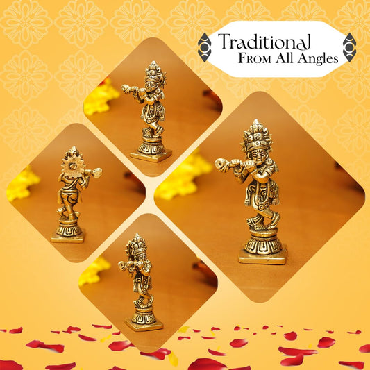 100% Pure Brass Lord Krishna Idol with Flute (8 cm) | Shree Lord Krishna Statue for Home Decor | Kanha Ji ki Murti for Office Desk | Sri Krishna Idols Gift for House Warming