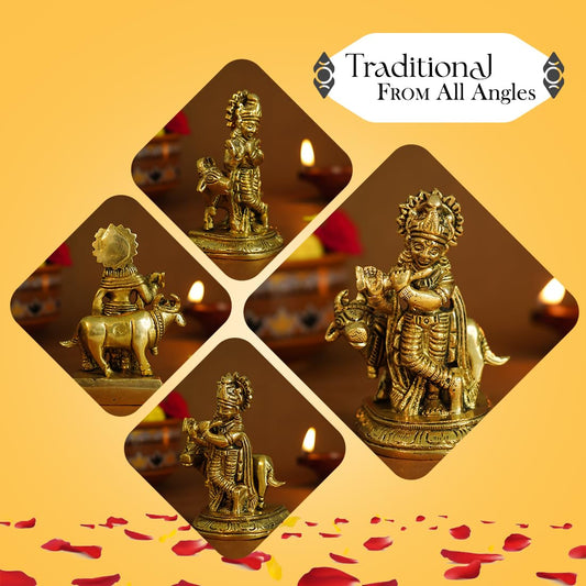 Krishna Small with Cow: Traditional Brass Lord Krishna Idol | 9 cm | Golden