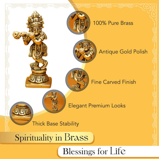 100% Pure Brass Lord Krishna Idol with Flute | 12.8 cm | Golden