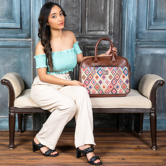 THE CLOWNFISH Deborah series 15.6 inch Laptop Bag For Women Printed Handicraft Fabric & Faux Leather Office Bag Briefcase Messenger Sling Handbag Business Bag (Multicolour-Diamond)