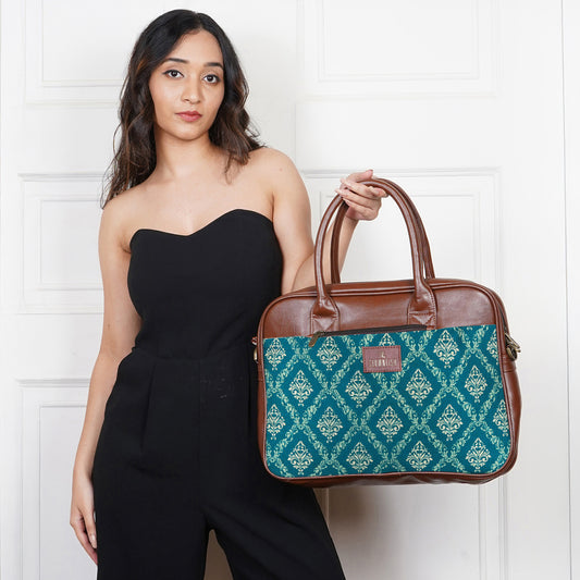 The Deborah Series 15.6 inch Laptop Bag for Women Printed Handicraft Fabric & Faux Leather Office Bag Briefcase Messenger Sling Handbag Business Bag (Cerulean Blue)