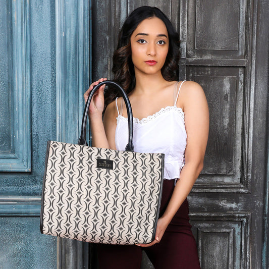 THE CLOWNFISH Opulence Series Multipurpose Handbag For Women Box Bag 14 inch Laptop Bag Tote Printed Handicraft Fabric & Faux Leather Bag (Black-Spade Design)
