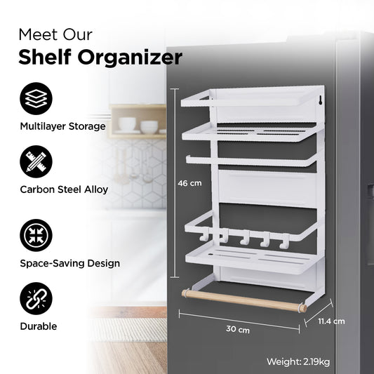 Magnetic Refrigerator Shelf | Multilayer Storage Rack with Towel Holder & Hooks | 30 x 11.4 x 46 cm | White