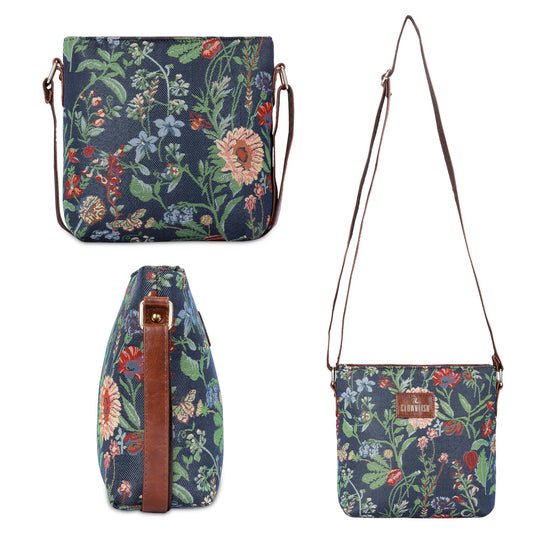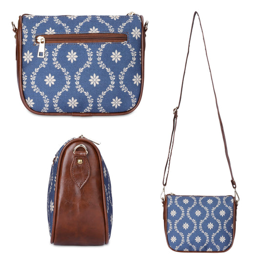 THE CLOWNFISH Combo of Linda Series Sling for Women Crossbody Bag for College Girls Lorna Tapestry Fabric & Faux Leather Handbag Sling Bag for Women (Navy Blue-Floral)