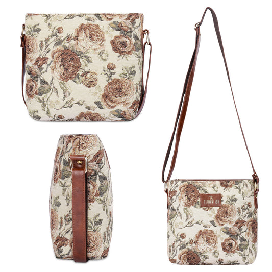 THE CLOWNFISH Combo Of Adelina Series Sling for Women Crossbody Bag for College Girls Lorna Tapestry Fabric & Faux Leather Handbag Sling Bag for Women (Brown-Floral)