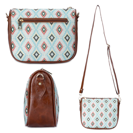 THE CLOWNFISH Garnet Series Printed Handicraft Fabric & Tapestry Crossbody Sling Bag for Women Ladies Single Shoulder Bag Shoulder Belt (Skyblue-Diamond)