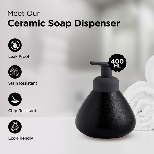 Liquid Soap Dispenser | Stoneware | Bathroom Sanitizer, Lotion, Shampoo Dispenser | Ceramic Handwash Bottle for Kitchen | Soap Dispenser for Wash Basin | Bathroom Accessories | 350 ml (Black)
