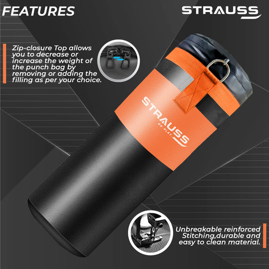 Strauss Canvas Heavy Duty Filled Gym Punching Bag|Hanging S Hook, Zippered Top Head Closure,Heavy Straps |Ideal for Boxing, MMA |Boxing Bag for Home Gym & Fitness Training|2 Feet,(Black/Orange)