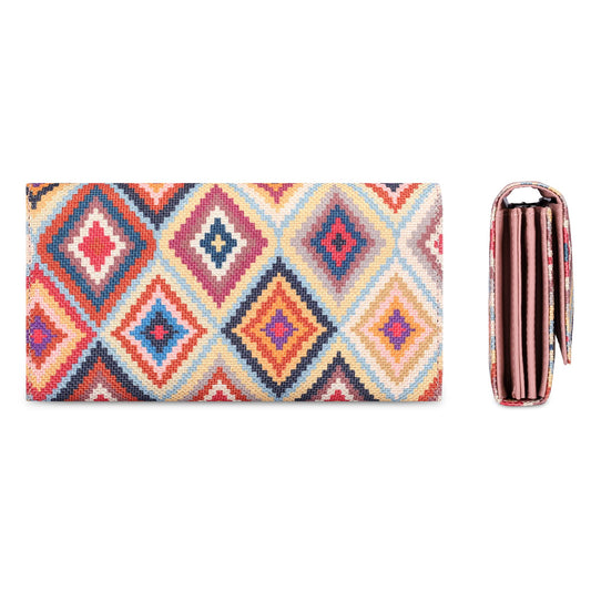 THE CLOWNFISH Charisma Collection Printed Handicraft Fabric & Faux Leather Womens Wallet Clutch Ladies Purse with Multiple Card Slots (Multicolour-Diamond Design)