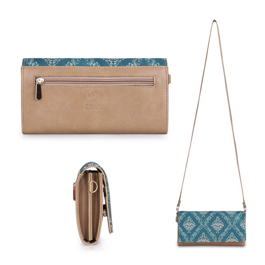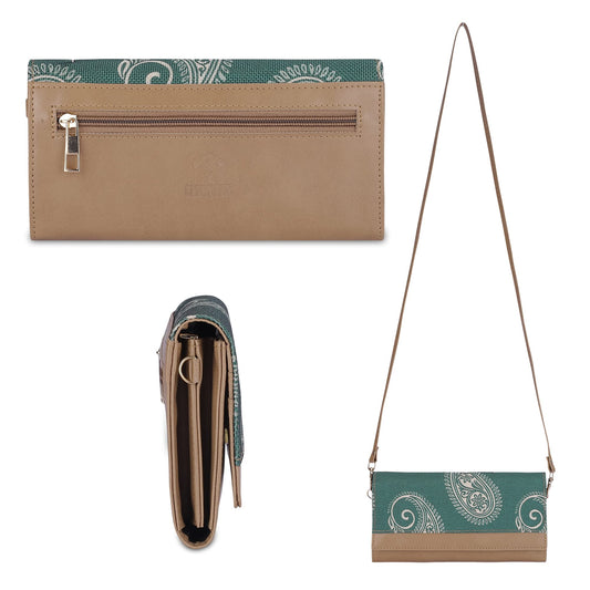 THE CLOWNFISH Erika Printed Handicraft Fabric & Vegan Leather Ladies Wallet Purse Sling Bag with Multiple Card Slots & Shoulder Belt (Fern Green)
