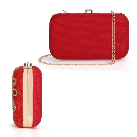 THE CLOWNFISH Angela Collection Womens Party Clutch Ladies Wallet Evening Bag with Fashionable Round Corners Beads Work Floral Design (Red)