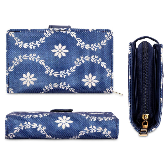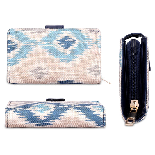 THE CLOWNFISH Fab Series Printed Handicraft Fabric & Vegan Leather Ladies Wallet Clutch Purse for Women Girls with Multiple Compartments (Royal Blue)
