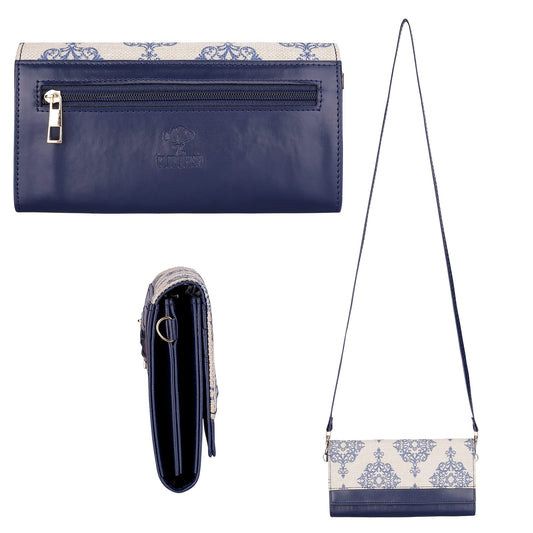 THE CLOWNFISH Women Jolene Printed Handicraft Fabric & Vegan Leather Ladies Wristlet Purse Sling Bag With Multiple Card Slots & Shoulder Belt (Blue)