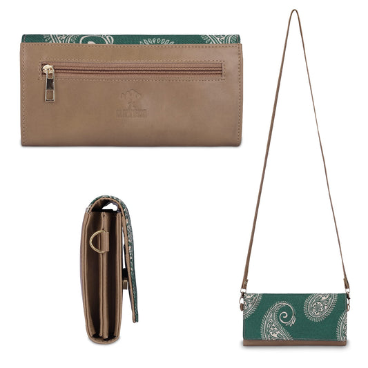 THE CLOWNFISH Jolene Printed Handicraft Fabric & Vegan Leather Ladies Wallet Purse Sling Bag with Multiple Card Slots (Fern Green)