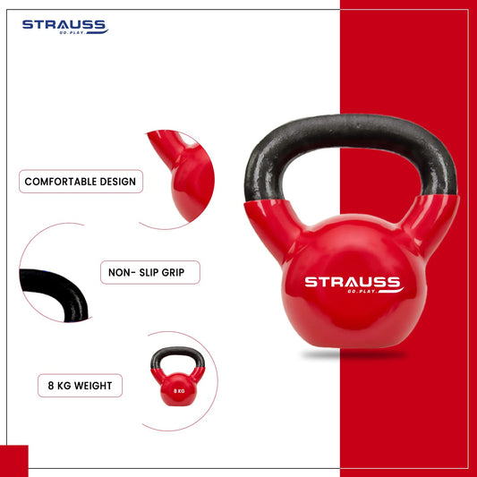 Strauss Premium Vinyl Kettlebell Weight for Men & Women | 8 Kg | Ideal for Home Workout, Yoga, Pilates, Gym Exercises | Non-Slip, Easy to Hold, Scratch Resistant (Red)
